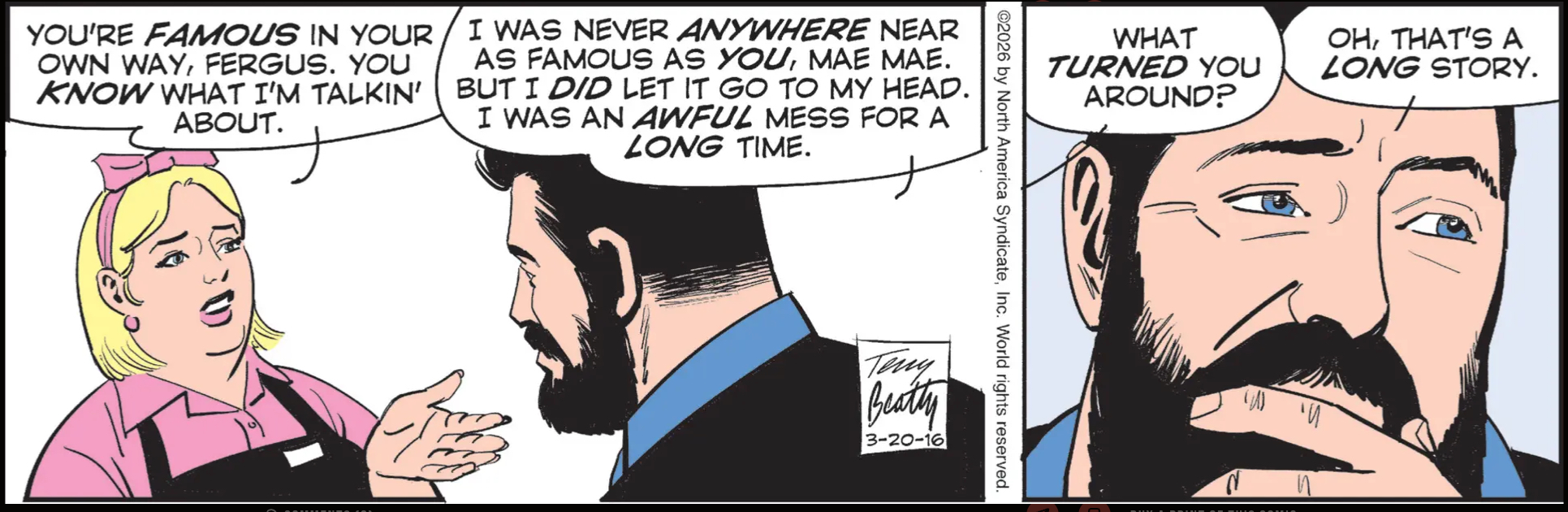 So, sorry for the long digression, but what I’m wondering here is: are we going to get a full-on retelling of the fake self-help Mirakle Method story, from Mud’s point of view? Will it differ in subtle but meaningful ways from the 2023-2024 strips that laid it out in the first place? Is Rex Morgan, M.D., being pieced together from ancient texts, and will this act of scholarship cause a worldwide religious transformation over the next few centuries? Stay tuned!