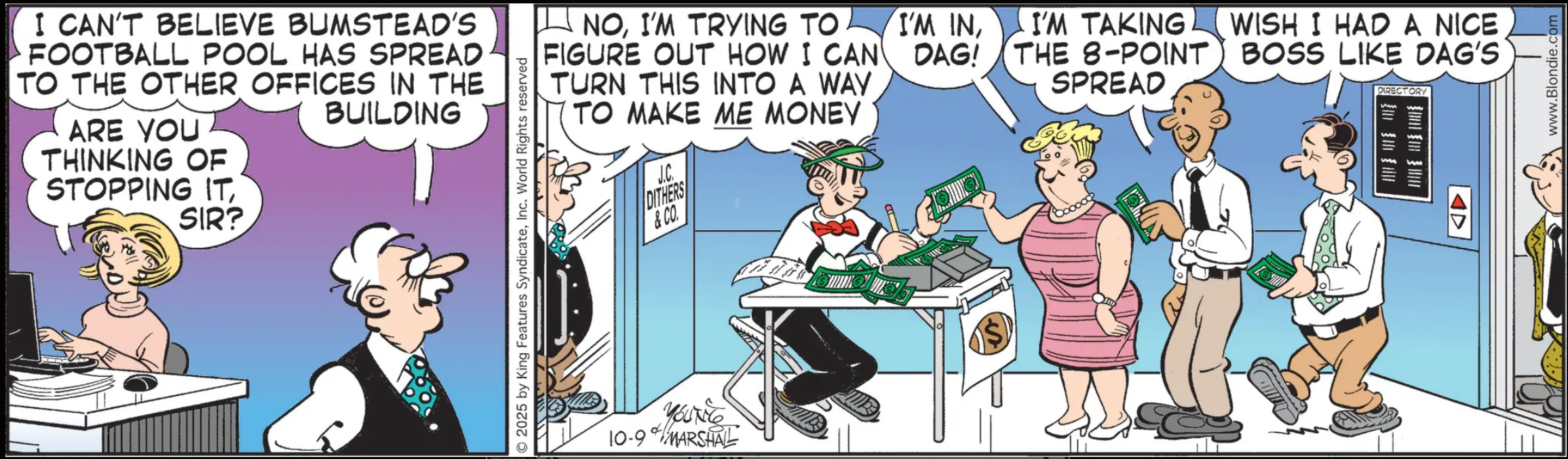 Look, fellas, when your wife tells you to put the toilet seat down, it’s not because she’s a shrew who likes nagging for nagging’s sake; it’s because she doesn’t want to accidentally sit down on the porcelain rim of the toilet bowl. If you, for instance, are a mythical dwarf, and your spouse isn’t, and you have your own specialized tiny toilet sized for your miniature hindquarters, she probably doesn’t care about the seat on that one. I guess it’s possible that the implication here is that the Seven Dwarfs only have a tiny toilet in their home, which would be reasonable given that they’re all tiny, and Snow White, who has moved in with them, resents this and brings it up at every opportunity. Either way, welcome to Mother Goose and Grimm scat joke season, everybody!