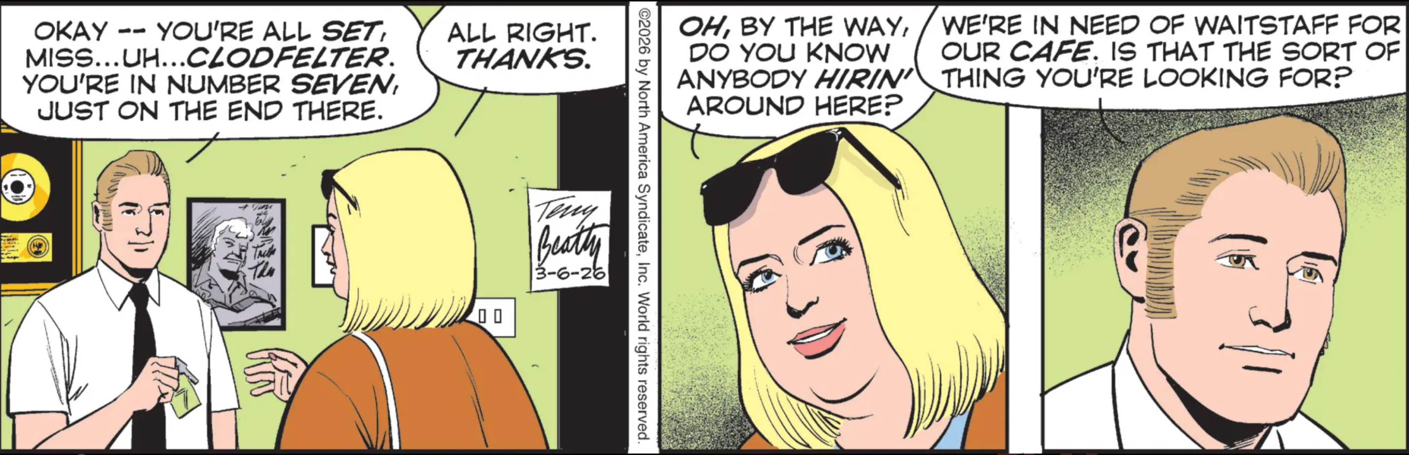 Oh, I forgot to mention the other day that we got a look at what our other beloved Rex Morgan, M.D. characters are up to, and what Heather is up to is being pregnant in England with the child of her now-fully-demented husband who no longer recognizes her, with the method she used to to achieve this state left tastefully unmentioned but presumably being along the lines discussed here. This means that family manservant Jordan’s job went from the extremely tricky (trying to help care for an increasingly infirm old man and offer emotional support to his bereft younger wife) to the comically easy (living in the Averys’ vast American mansion and, like, making sure it doesn’t burn down or anything). Apparently the price he has to pay is that whenever he brings a lady over, he has to kill any sexual tension by reminding her of her own mortality. He doesn’t make the rules!