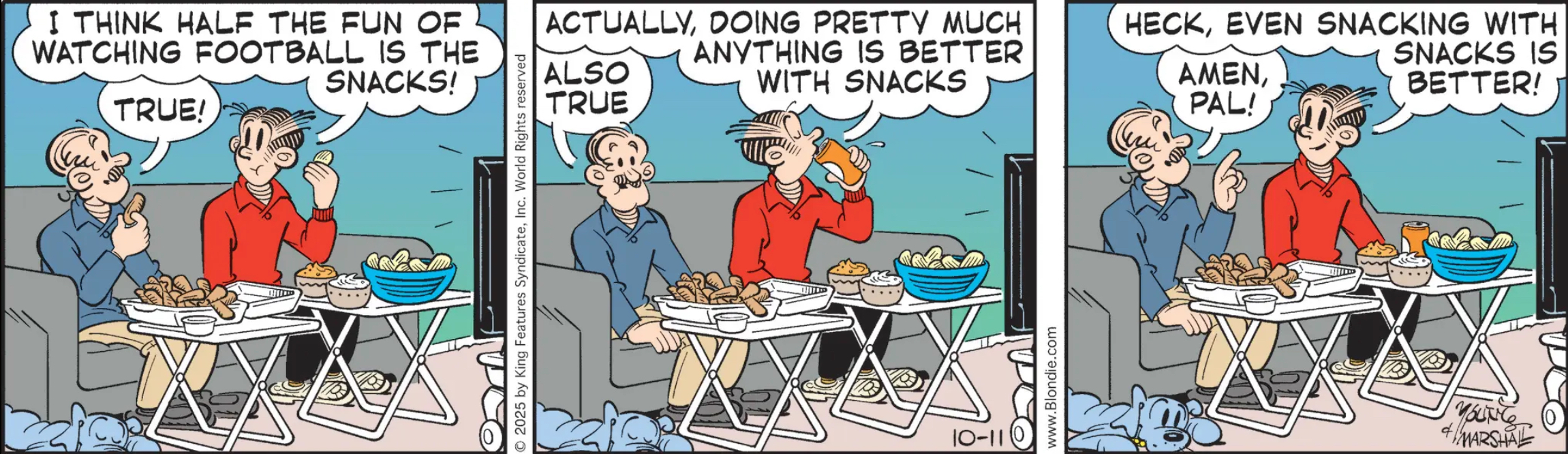 Blondie: Snacking is half the fun of watch football in Dagwood’s world. The other half of the fun is the half-time boinkfest with Herb.
