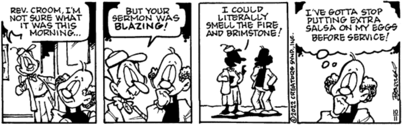 Mortal! Do you wish to get the merest glimpse of what it would be like for your soul to be tortured forever, in hell? Well, check out Rev. Croom’s breath, or, depending on the implications you’re getting from this strip, farts.