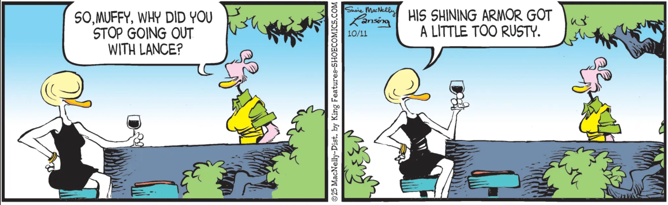 Shoe: “So, Muffy, why did you stop going out with Lance?” “I can’t be in a relationship where both our names are euphemisms for genitals.”