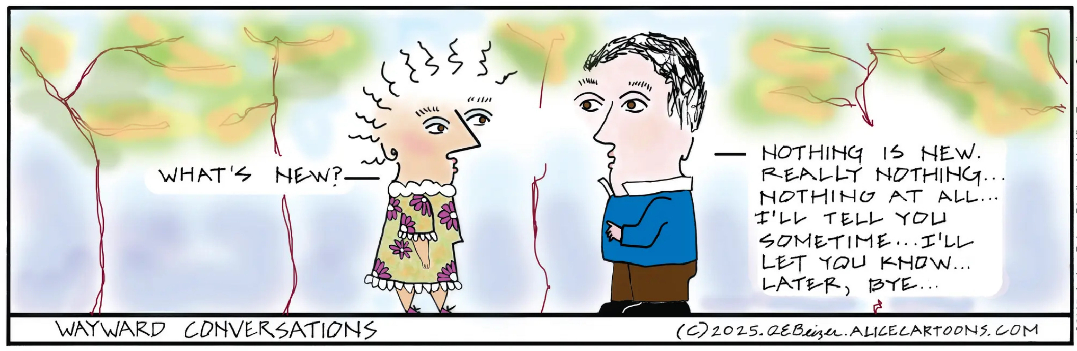 Alice: There is something haunting about the trees here, their emaciated trunks twisted underneath a cloud of half-changed leaves. It’s almost apocalyptic, which adds a dark touch to the banality of the “wayward conversation”. Mister Boring has done some unspeakably horrible things to survive in this hellscape. Someday, he’ll have the courage to speak of them, but not yet. Not yet.