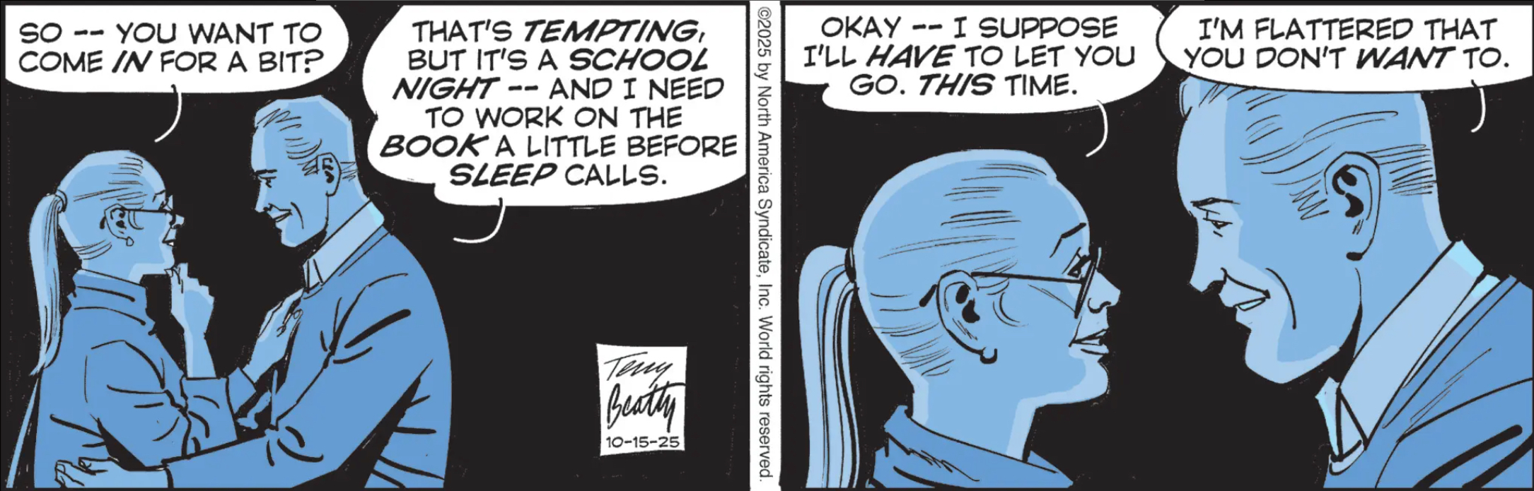 Luann: AI slop? *That’s* what this is about? I don’t know whether to be impressed that for once the Evansii are actually being really, most sincerely topical, or laughing at the hypocracy of them complaining about generic AI-generated art when up until now their strip has been nothing but paper dolls except when indulging Evans Senior’s fetishes (see Bets’ Catwoman getup a few weeks ago).