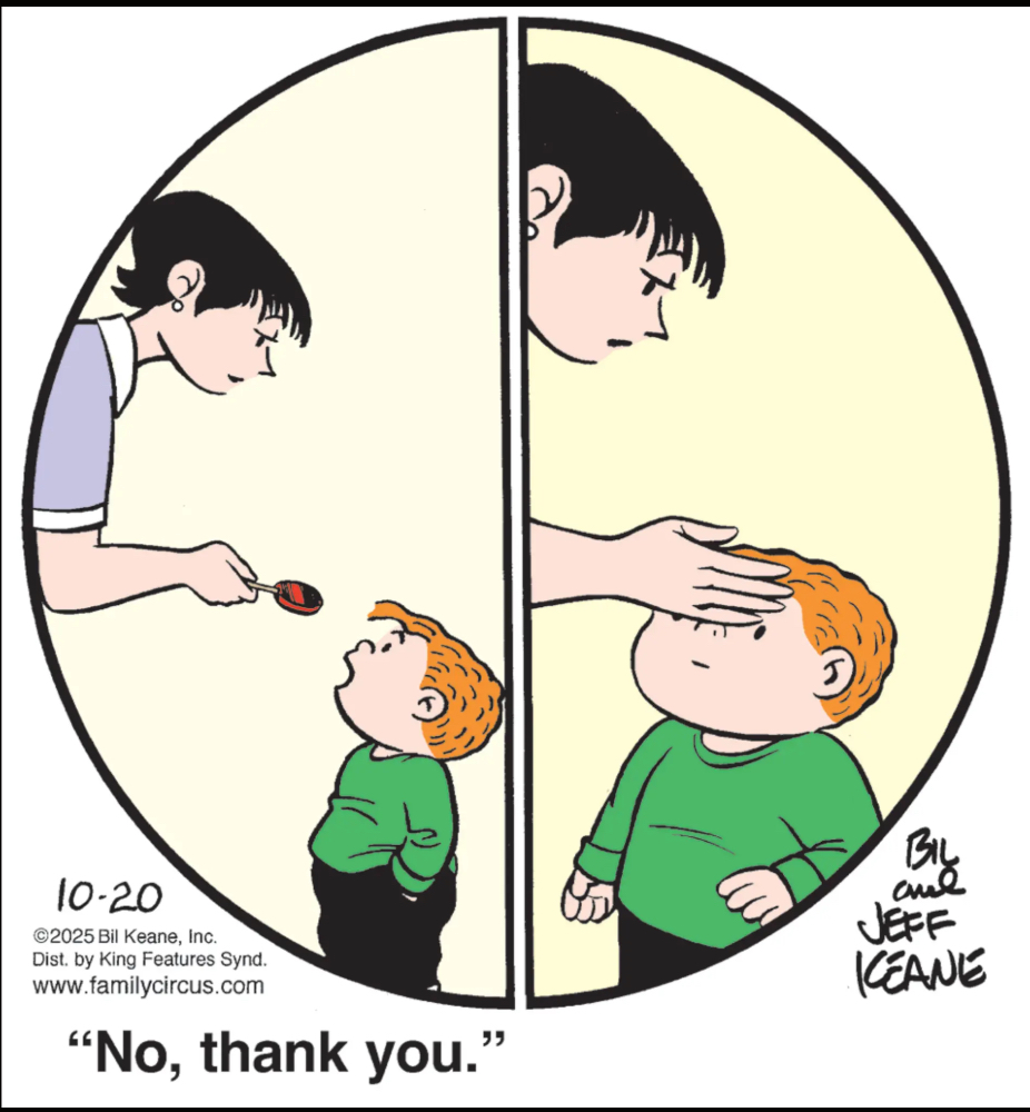 FC: Calvin and Hobbes did this joke, with Calvin’s mom realizing Calvin must really be sick when he doesn’t care that it’s a Saturday and he won’t miss school as a result. So, thank you Family Circus for making me remember an infinitely better and funnier version of this gag.