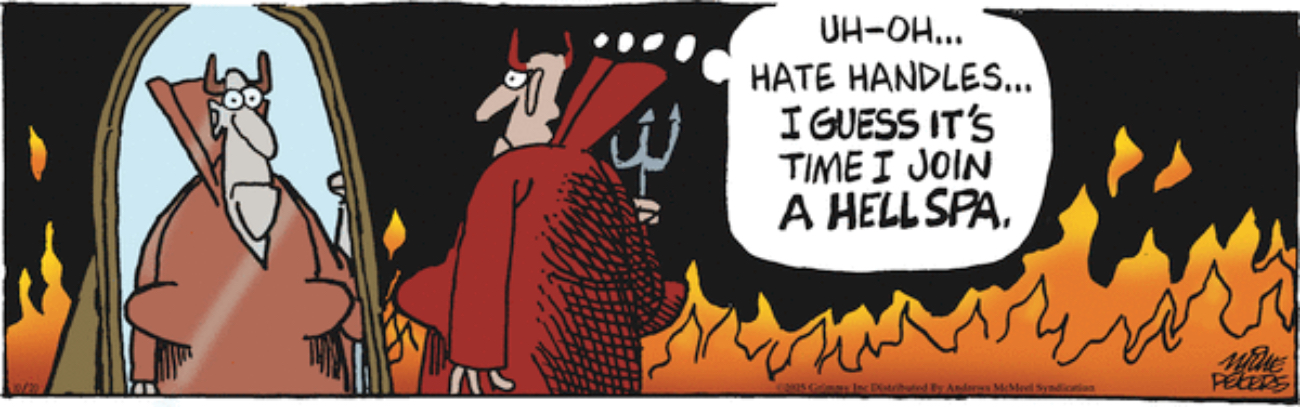 Mother Goose and Grimm: Those look less like hate handles and more like sagging boobs, and less like sagging boobs than “I ate a giant salami and now it’s sticking out of my guts sideways.” In which case — half points — a Hell Spa would indeed by very, very appropriate.