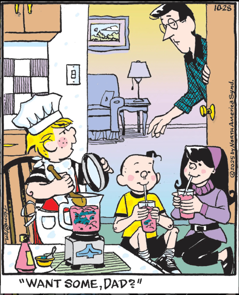 DTM: Does Dennis mean “Want some, dad?” Or does he mean “Want some dad?” Note that we can’t see most of Henry’s body. Who knows which parts of him went into that suspiciously minced meat-looking smoothie? Halloween week is off to a good start.