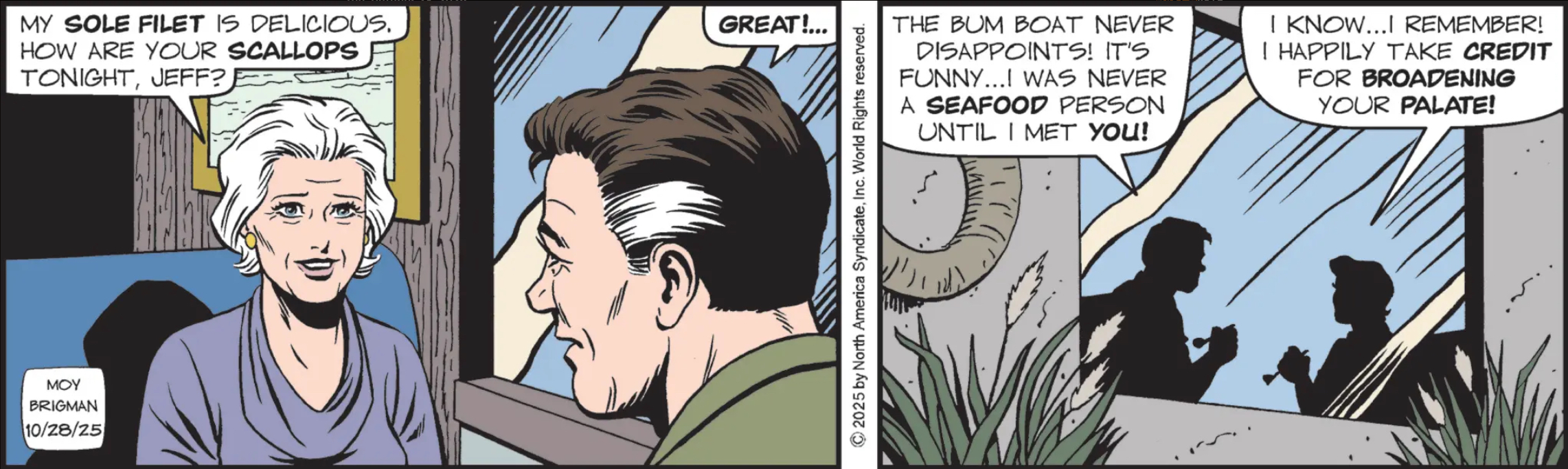 I admit, I’m not a professional comic writing person who has to churn out 365 strips a year (366 on leap years) so I understand there is no world in which every day is going to be a winner. However. I’d like to think I still be able to avoid a day where it’s just two people talking about their dinner in the most generic way possible. Even Dr. Jeff’s revelation about him not being a “seafood person” until he met Mary could have been “I was not a seafood person until you talked me into trying that amazing, eye-opening lobster roll” or something and explain the experience. I can’t believe I’m saying this, but borrow from anime! I wish I could love food as much as anime characters do.