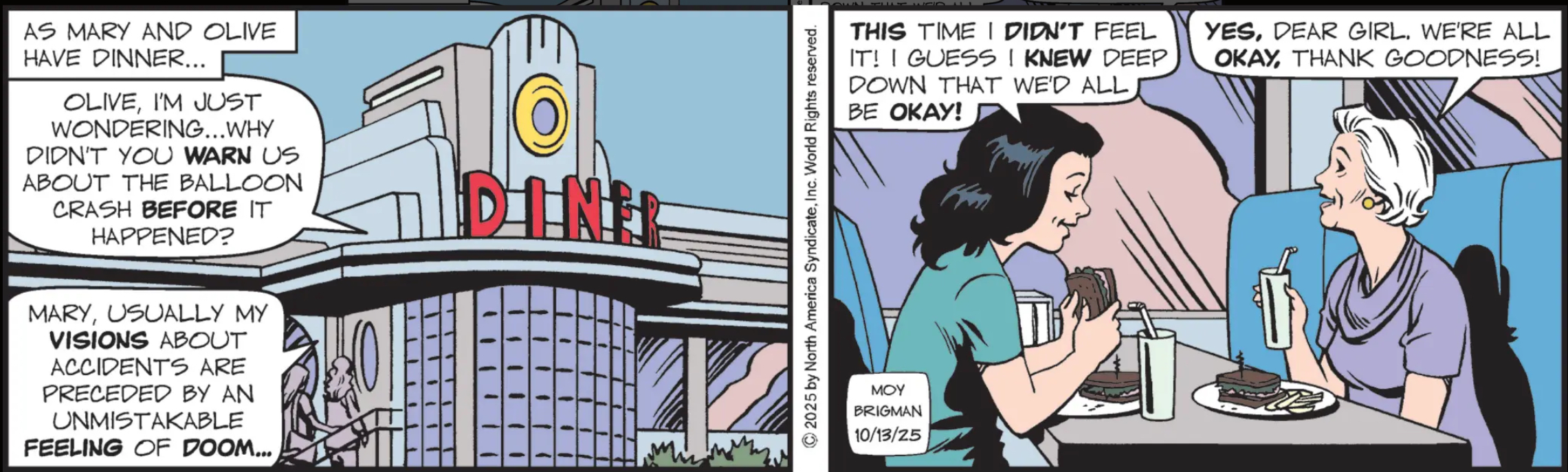 Mary Worth : is going to prod Olive into admitting she’s the one who sent the telepathic message to Max and Greta, so that they can have their little victory lap about Olive’s powers saving the day. Can next week come?