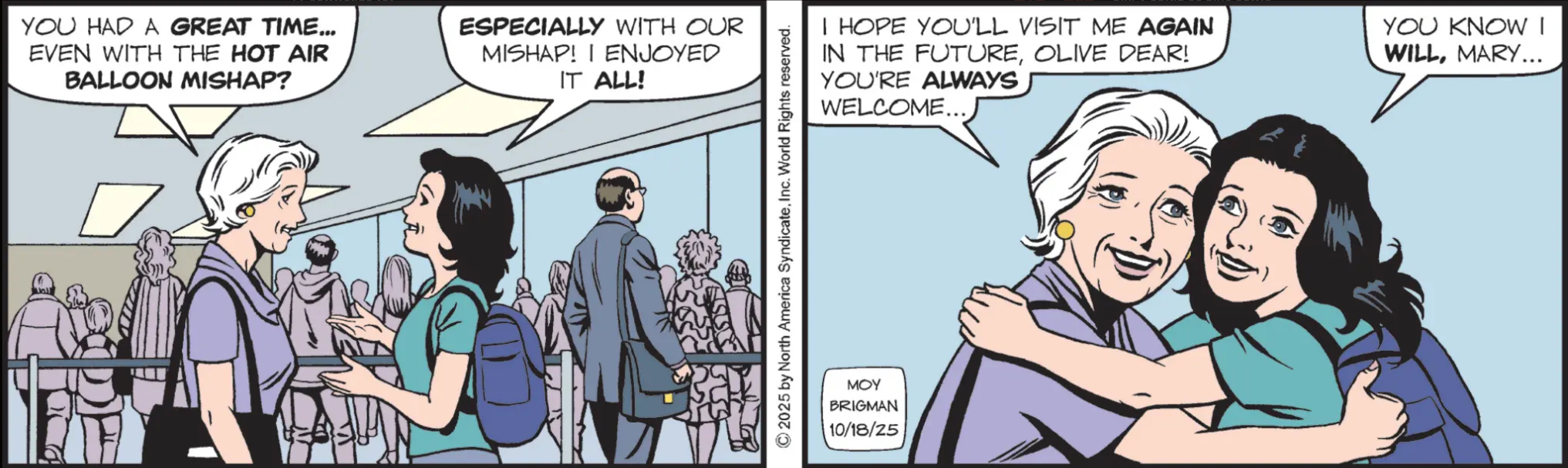 I know that Mary and Olive billed this visit as a “mini-vacation” but I have to say “all I had time to do on my cross-country trip is briefly meet some dogs in a condo parking lot and then almost die in a hot air balloon mishap” is truly mini indeed. I guess it’s possible that Olive’s parents heard about the accident on the news, or, given that this is the year 2025, saw a clip of it in a “CRAZY HOT AIR BALLOON MISHAPS” YouTube compilation, and decided that was a little much even by their notoriously lax parenting standards, so they summoned her home early because “we think she has to start going to school or whatever soon.”