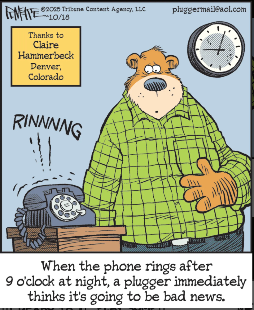 Bear-Plugger, you are an amateur. When the phone rings at any time I always think it’s going to be bad news! Whether I answer it or not! I’m a walking ball of anxiety! By Plugger rules this makes me a good person, right?