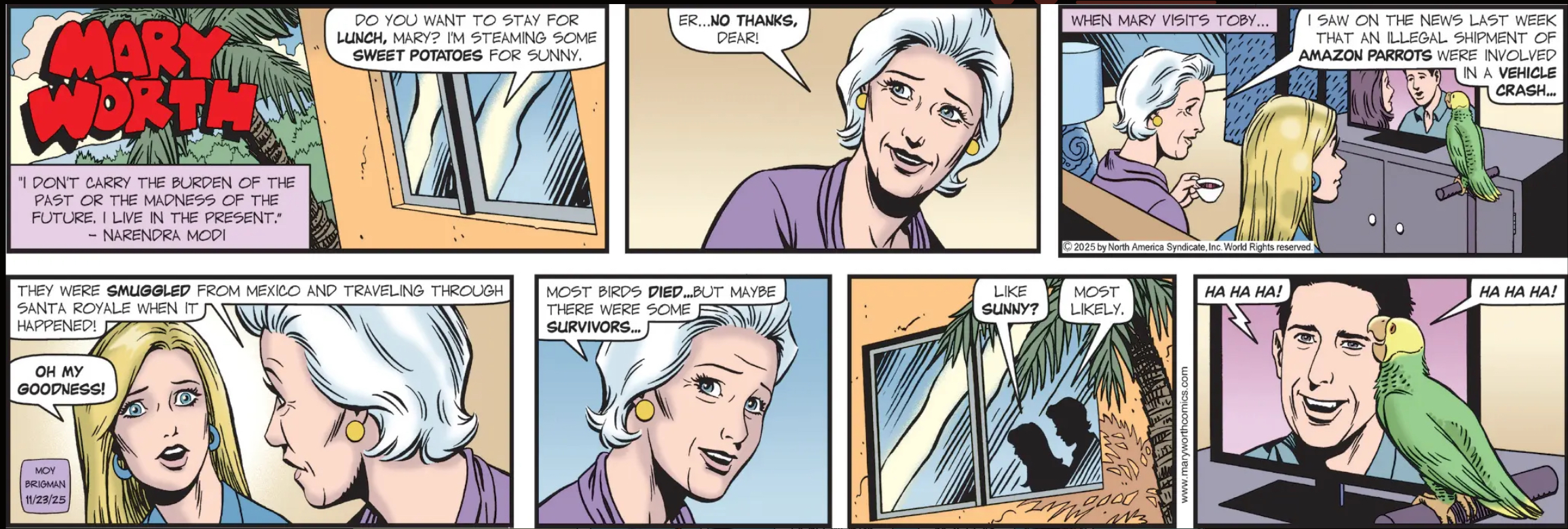 Mary Worth: Sunny is laughing because he caused the truck crash to get rid of his fellow parrots, who were squealing to the American authorities. And now he knows he’s gotten away with it. “Ha-ha-ha, my comrades from Tren de Agua will soon come and bring me back home, and I’m afraid the ladies who helped me will be collateral damage. But thanks for the muffins, suckers!”