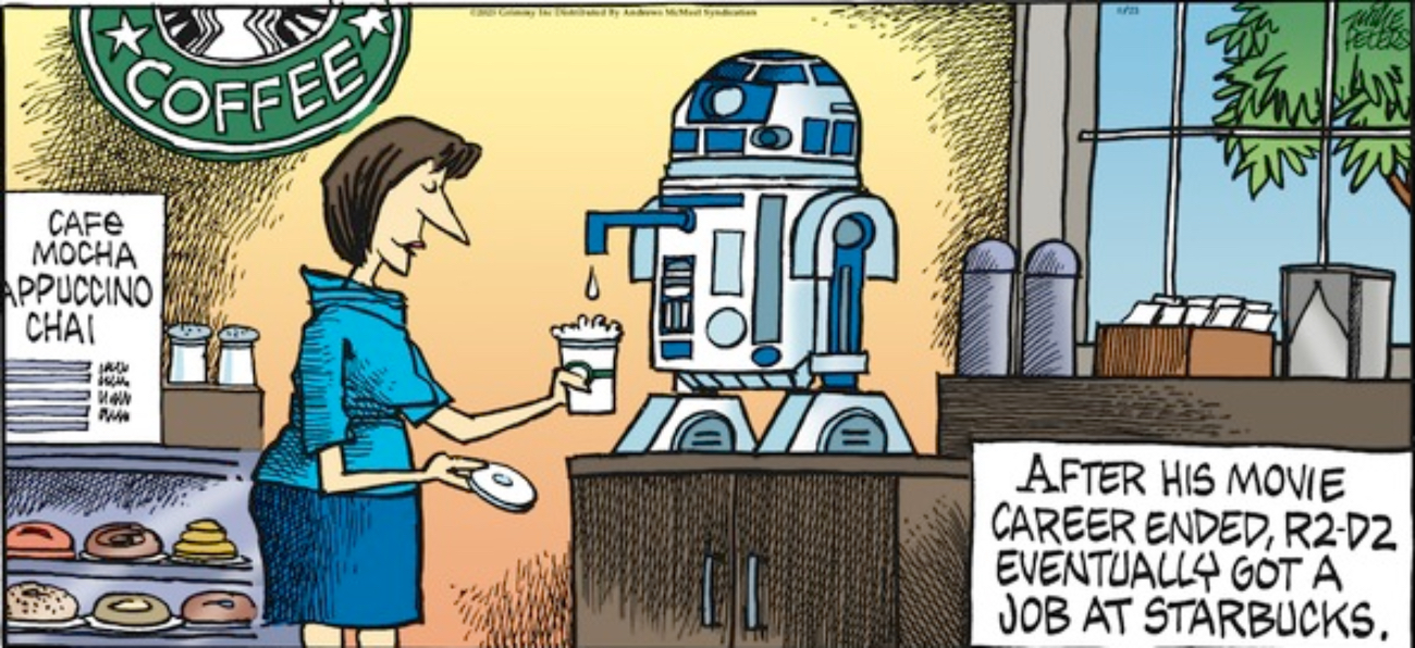 On one level of conceptual reality, R2-D2 is a droid living a long time ago in a galaxy far, far away, and on another level R2-D2 is Kenny Baker and a series of other actors inside a mechanical prop in various movies and TV shows put out by Lucasfilm. Or, in Mother Goose and Grimm, R2-D2 is an actor who had a movie career, presumably playing R2-D2 the character in the Star Wars movies? I don’t find this mix of narrative planes very coherent, to be quite honest, and I don’t think it’s funny to make R2-D2 into a coffee machine either. He helped blow up the Death Star! Show some respect.