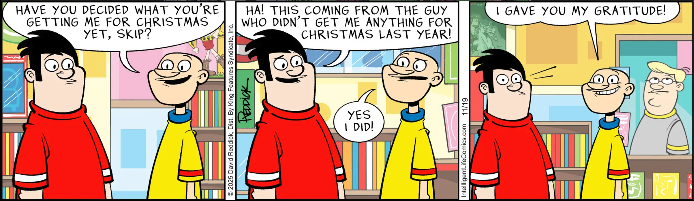 For my sins, I have come to be able to recognize the various recurring characters in Intelligent Life, even if I often forget their names, and I can tell you that the guy in the background in panel three is not one of them. I think it would be good if more nameless background characters showed up to roll their eyes at the terrible punchlines in this strip, though. Maybe it would inspire enough shame to grind this whole enterprise to a halt!