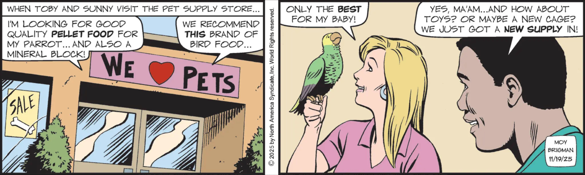 Also Mary Worth: Sale bone? “We ♥ Pets” on an obviously hand-lettered sign? If you’re going to shop a fly-by-night store, Toby, at least go to Parrots Rrawwk.