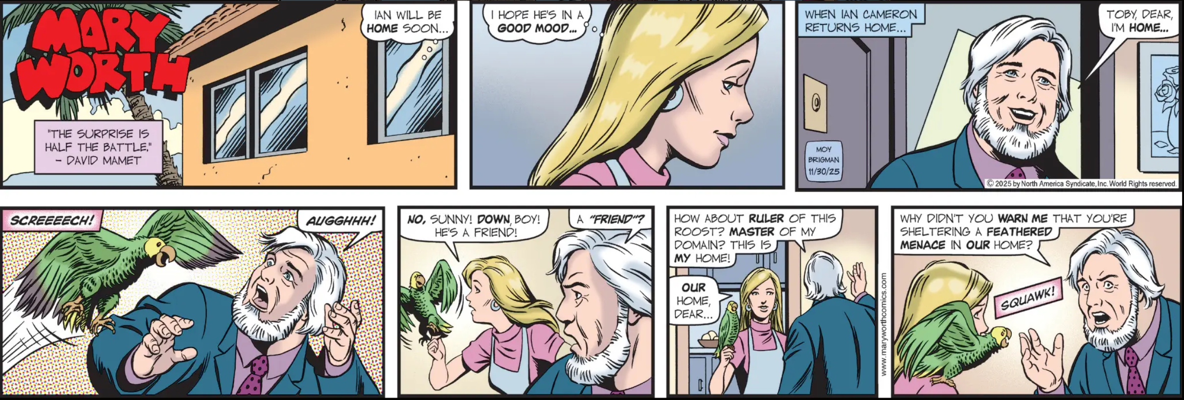 Ahh, the moment we’ve all been waiting for: when Ian returns from his weeks-long “teachers conference” and confronts the bird who has taken his place and reduced him to a mere “friend” of the household. This bird was perfectly nice to Mary when she came over, so he obviously isn’t strictly speaking aggressive towards newcomers; rather, he just instinctively recognizes Ian as his main antagonist going forward and has decided to go on the attack from a position of strength as the current possessor of the disputed territory. I’m glad this week’s Sunday Mary Worth Quote® is from David Mamet, because that implies that the dialogue that ensues after the final panel is just a nonstop stream of colorful obscenities.