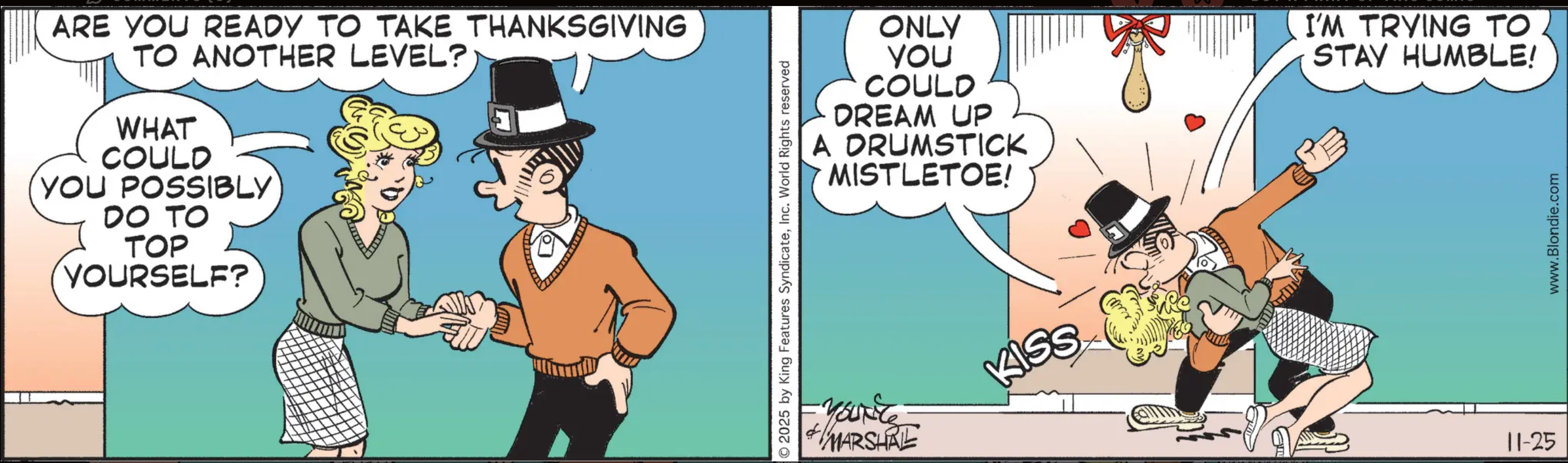 Blondie: Dagwood’s kissing Blondie but he’s thinking about turducken.