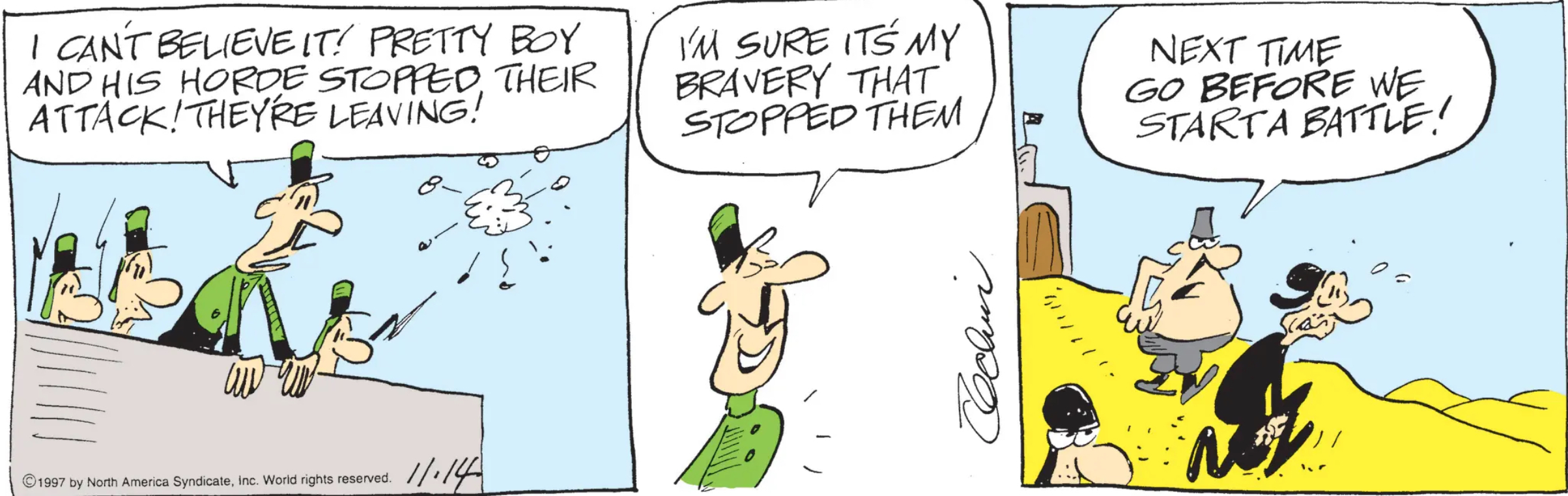 Man, you read Crock every day for 20 years and you assume you know all the stupid lore but then you read a strip and learn that the shirtless guy in the fez is named “Pretty Boy”. This is pretty dumb, but in a strip where the cowardly guy is named “Captain Poulet” and the woman who’s supposed to be ugly is named “Grossie” and the evil commandant is named “Vermin P. Crock,” having a character with a sarcastic name represents a quantum leap in semantic complexity. Unless this guy is actually meant to be read as attractive? Possible, I guess. Anyway, one of his soldiers has to pee, which has foiled his attempt to capture the Legion’s fort and kill everyone inside.