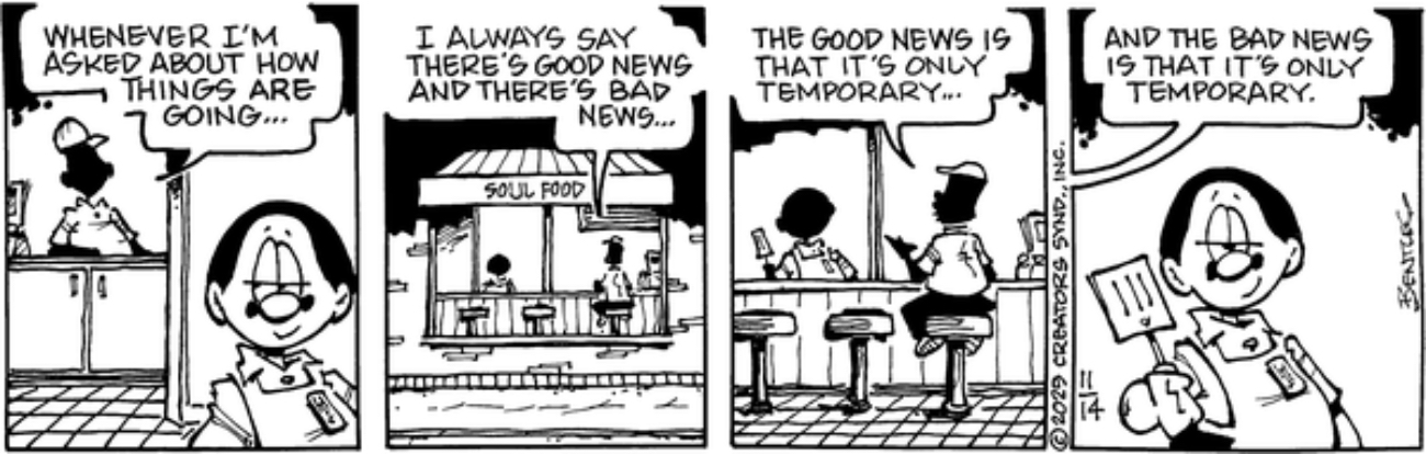 Herb and Jamaal: I assumed he meant that the good news is that the bad news is temporary and the bad news is that the good news is temporary.