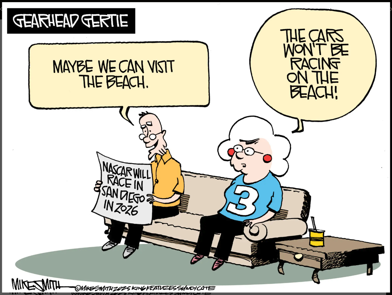 Gertie marital dysfunction watch: Gertie’s husband, learning about a new venue for NASCAR racing, has preemptively compromised on their next vacation, hoping to combine some of the racing action his wife loves with a relaxing beach day of the sort that you’d think would appeal to just about anybody. “No,” says Gertie. “Fuck you. That’s not how this works. You know that’s not how this works.”