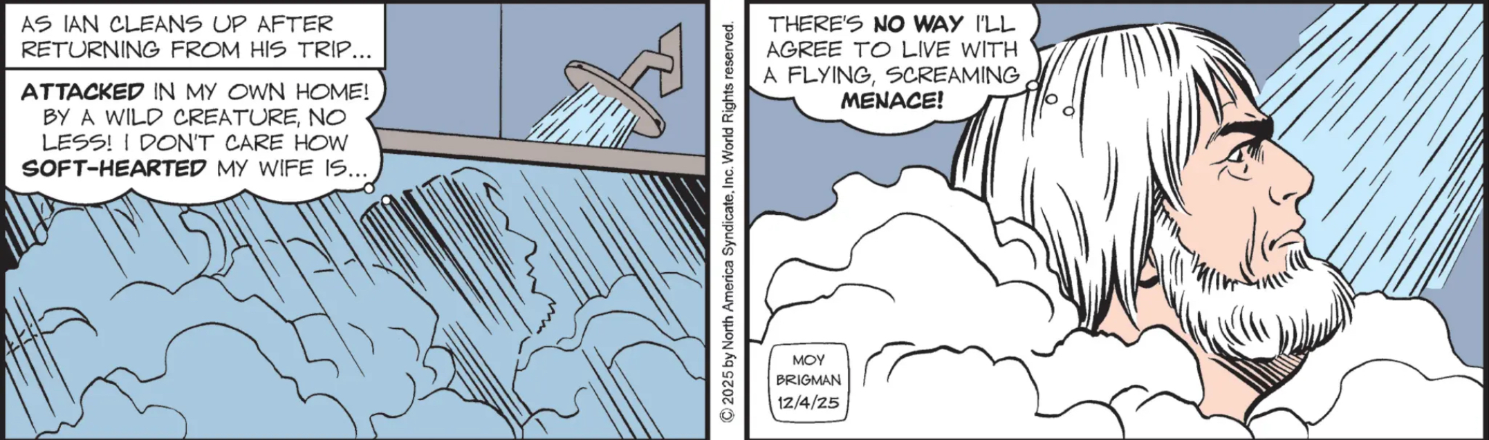 MW: Unused Panel Three: From behind him in the shower, Ian suddenly hears a voice cackle,”Squawk! Pass the Old Spice body wash, Chubby! Squawk!”
