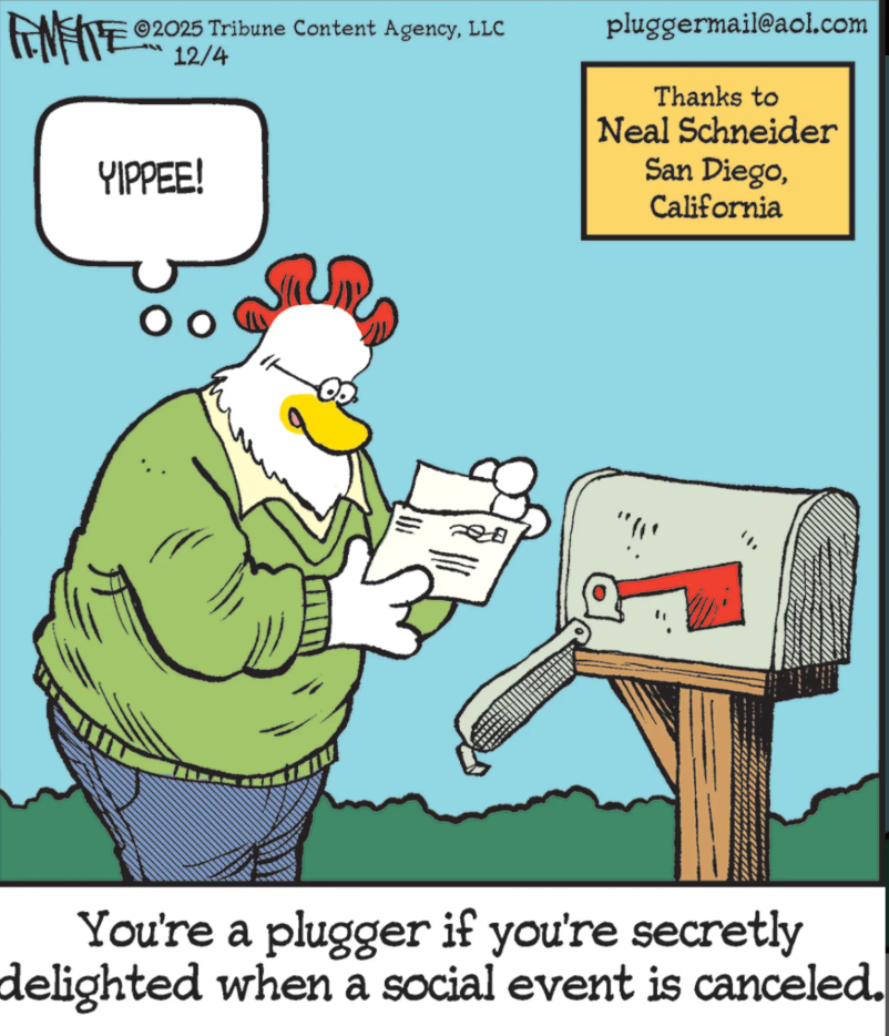 You’re a plugger if you get invited to the sort of social events whose cancellation you’re notified about via a formal notice delivered by the U.S. Postal Service.