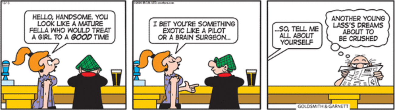 Hartlepool is part of the Tees Valley Combined Authority, a conurbation of 700,000 people in the far northeast of England, and it’s frankly sad that brain surgeons are so thin on the ground there that this young (?) woman would call the profession “exotic.” Ditto for pilots, especially given the poor state of the British rail system! Anyway, I used to read Andy Capp as a kid and one of the strip’s running bits that puzzled and disturbed me the most was when women at the pub would flirt with Andy. How old were they supposed to be? Were we supposed to read them as attractive? Didn’t they know he’s married? These questions still haunt me today, but not as much as this woman’s unnaturally located and shaped breasts, which I think is a 21st century addition to the strip.