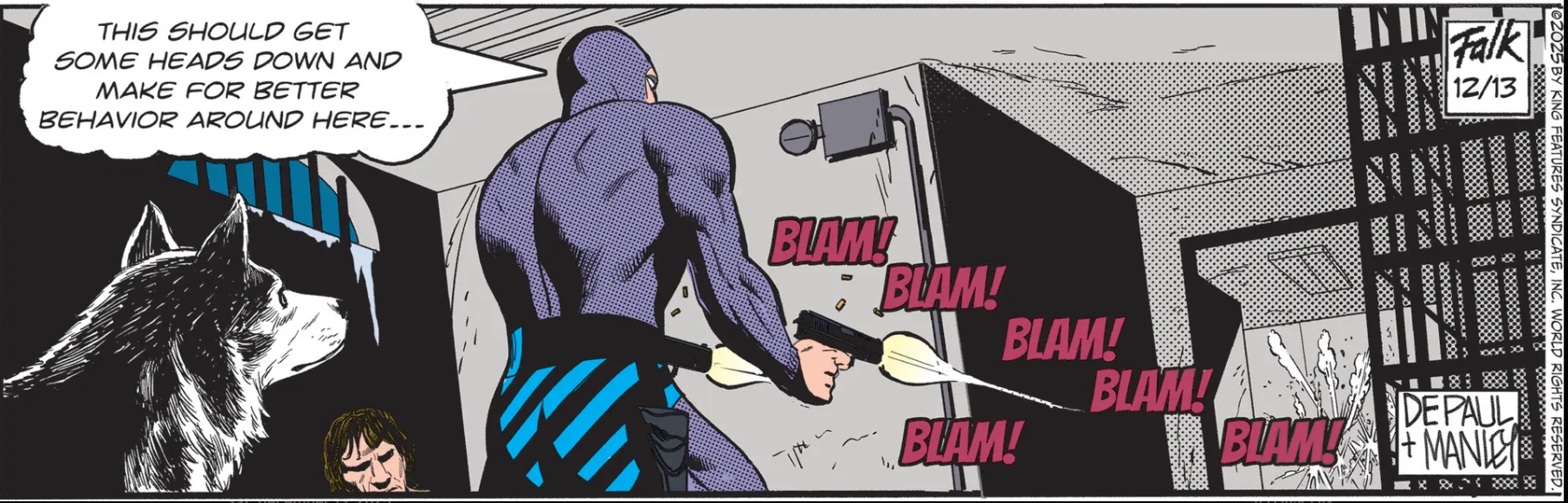 The Phantom: “This should make for better behavior around here!” says the Phantom. The bad guys can’t hear him over the sound of machine-gun fire, but he really meant it as training for his wolf-dog in case it ever decides to bark at the mailman or chew on his slippers.