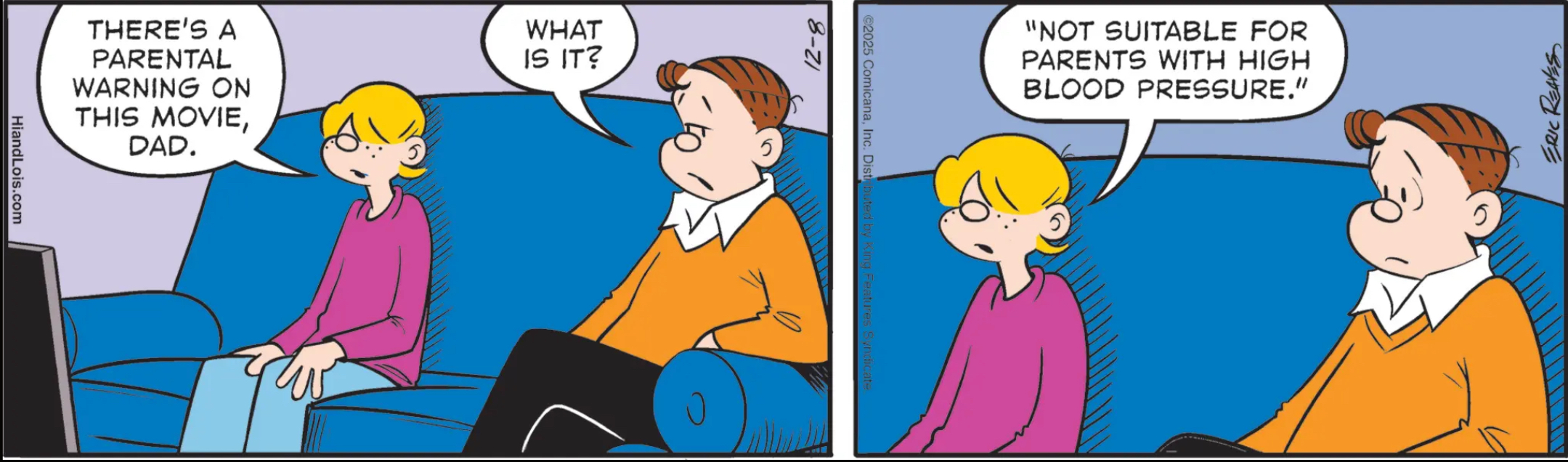 Let’s forget for a moment the incomprehensible/not funny punchline of this one and try to understand the lead-up to it. Why is Chip telling his father, who is watching exactly the same movie that he is, that there’s a parental warning on it? Shouldn’t Hi be just as capable of reading it as Chip is? Is it written in some format that only teens can read, like, uh, Minecraft font? Is there a Minecraft font? Is Minecraft still a thing that teens like, in the year 2025?