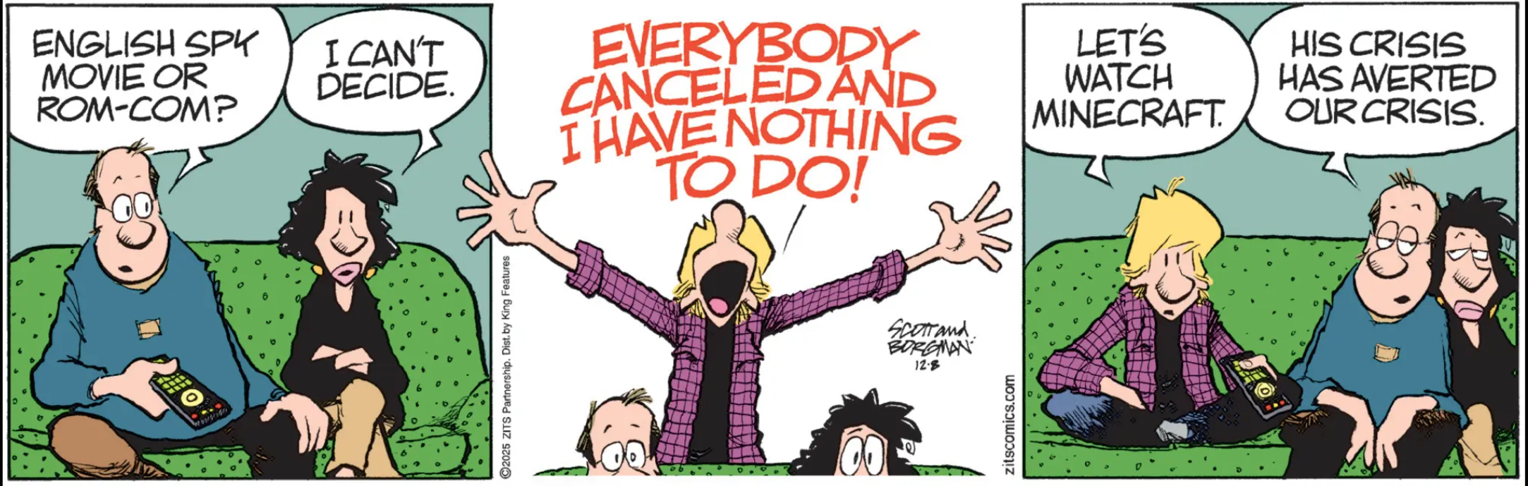Honestly, while I’m fine with the Zits parents (who were my boomer parents’ age when the strip debuted in the ’90s) staying the same age but becoming Gen Xers, I’m a little unsettled by Jeremy (who was just a few years younger than me when the strip debuted in the ’90s) staying the same age but being into things that contemporary teens are into, like Minecraft. I mean, Minecraft is still a thing that teens like, in the year 2025, right? “Watching” Minecraft? Surely the syndicated newspaper comic strip Zits wouldn’t steer me wrong about teens!