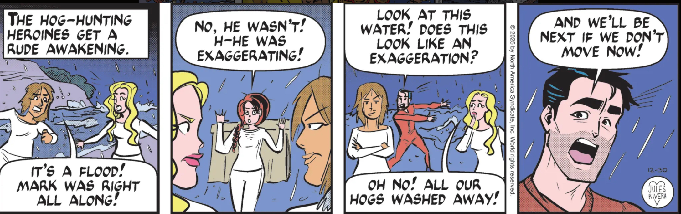 Mark Trail is wearing a union suit dealing with some Texas flooding (ripped from the headlines of six months ago) while accompanying an expedition of ladies hunting feral hogs (ripped from a 2019 viral tweet). This gives one of the ladies the opportunity to say “Oh no! All our hogs washed away!” which I think is funny! I just think it’s a fun thing to say!