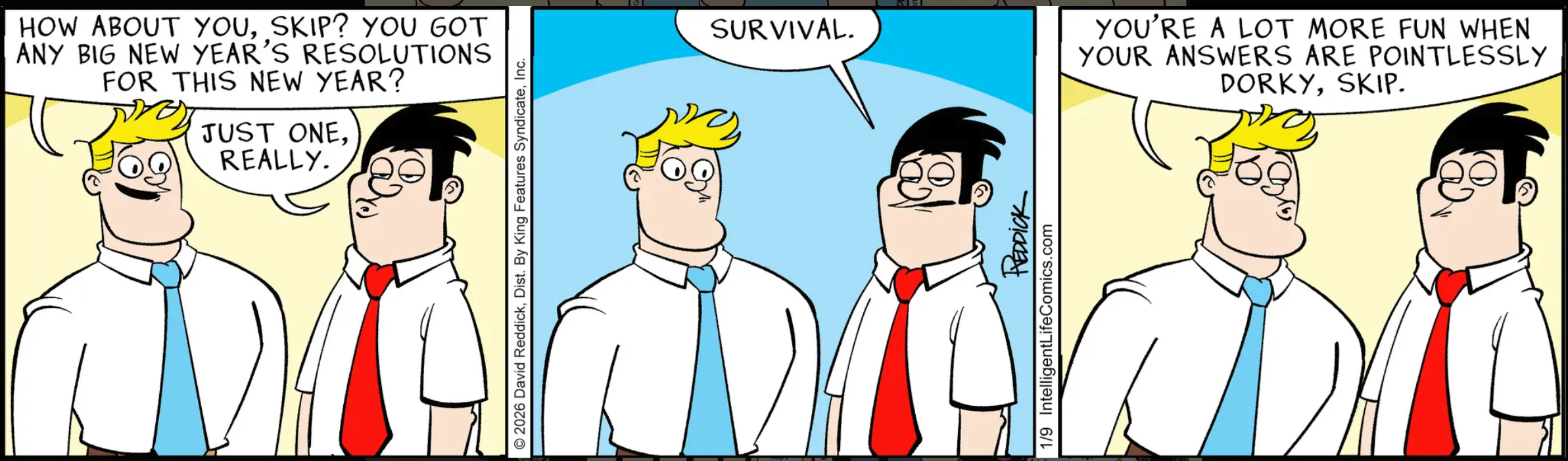 I’m not familiar with this Intelligent Life character, are they dating or something? He’s definitely going in for a kiss in panel three, although Skip doesn’t seem to be into it.