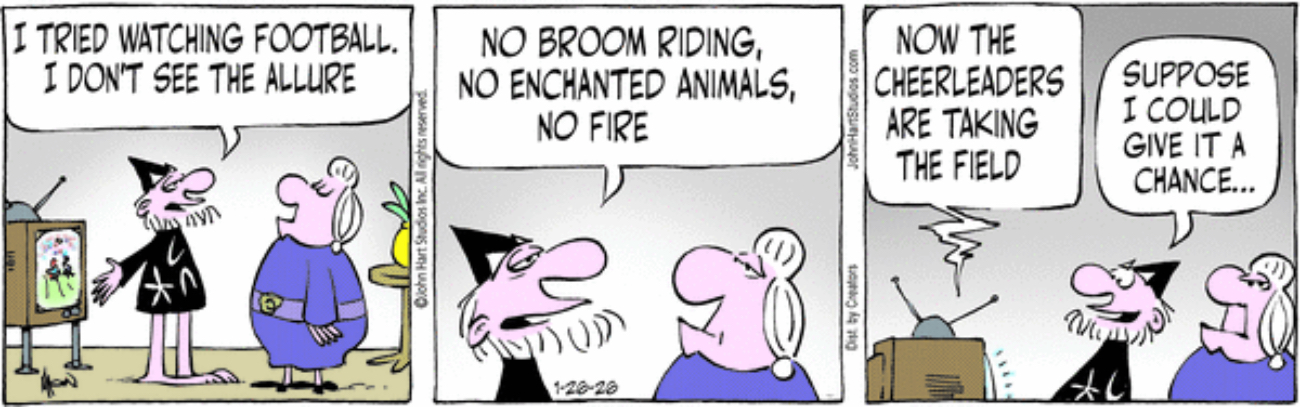 Yeah, I know, typically I make the Walker-Browne strips be set in the WarHams, but…Imagine only watching football for the cheerleaders but not watching competitive cheerleading. Though it’s possible that the Wizard’s magical television can only pull in over the air signals from that future far-off land and not from cable.