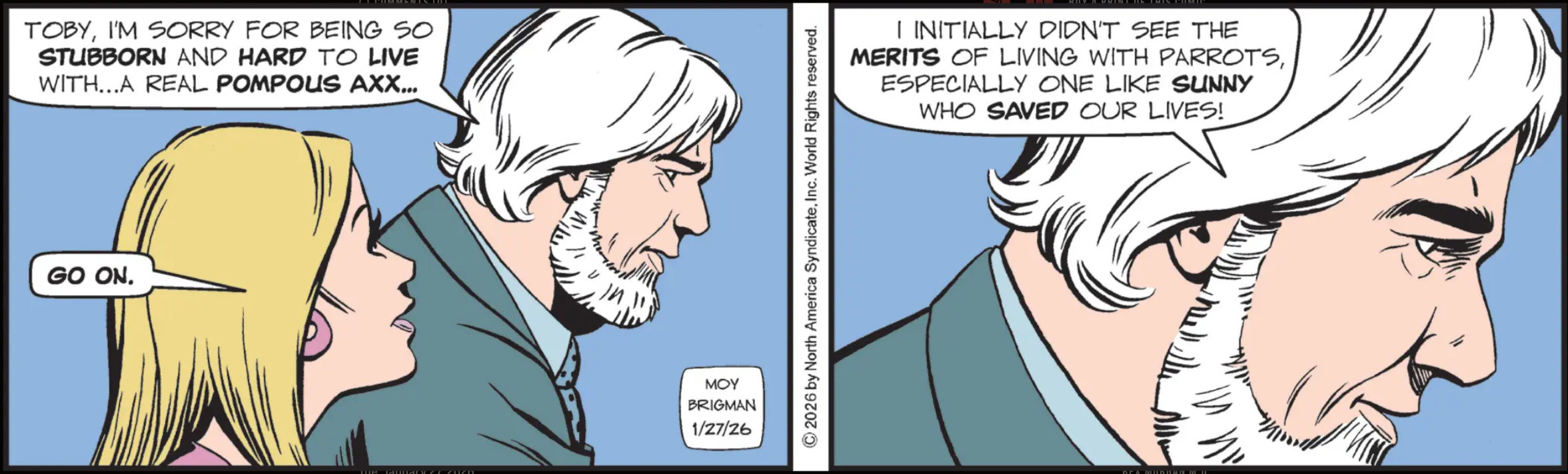 Mary Worth : when Cameron said “go on”, she was expecting Ian to continue listing insulting names he’s been called other than “Pompous Axx”. So she’s very disappointed the actual direction he was going in was “parrots, like dogs, are good”.