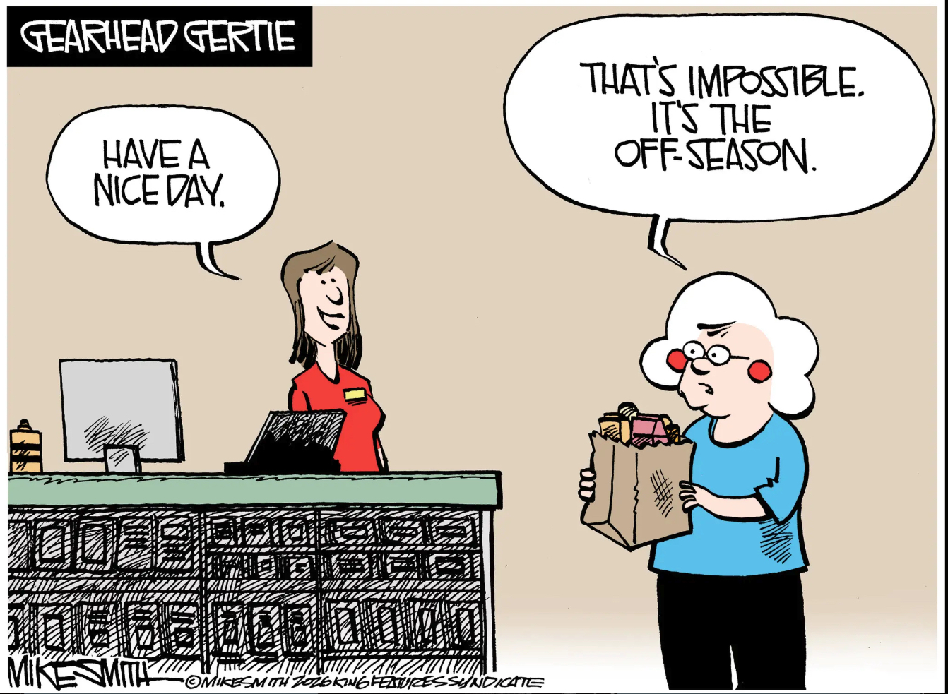 I was going to make a comment about Gearhead Gertie’s inconsistent leg length across different strips, but in researching this I discovered that if you type “gearhead” into Google, “Gertie” is not even one of the recommended next words in the list, and the realization of this comic’s apparent lack of relevance in the subculture which it desperately seeks to inhabit made it all feel so pointless. I don’t want to kick Gertie while she’s down. She’s doing enough of that on her own with those weird legs.