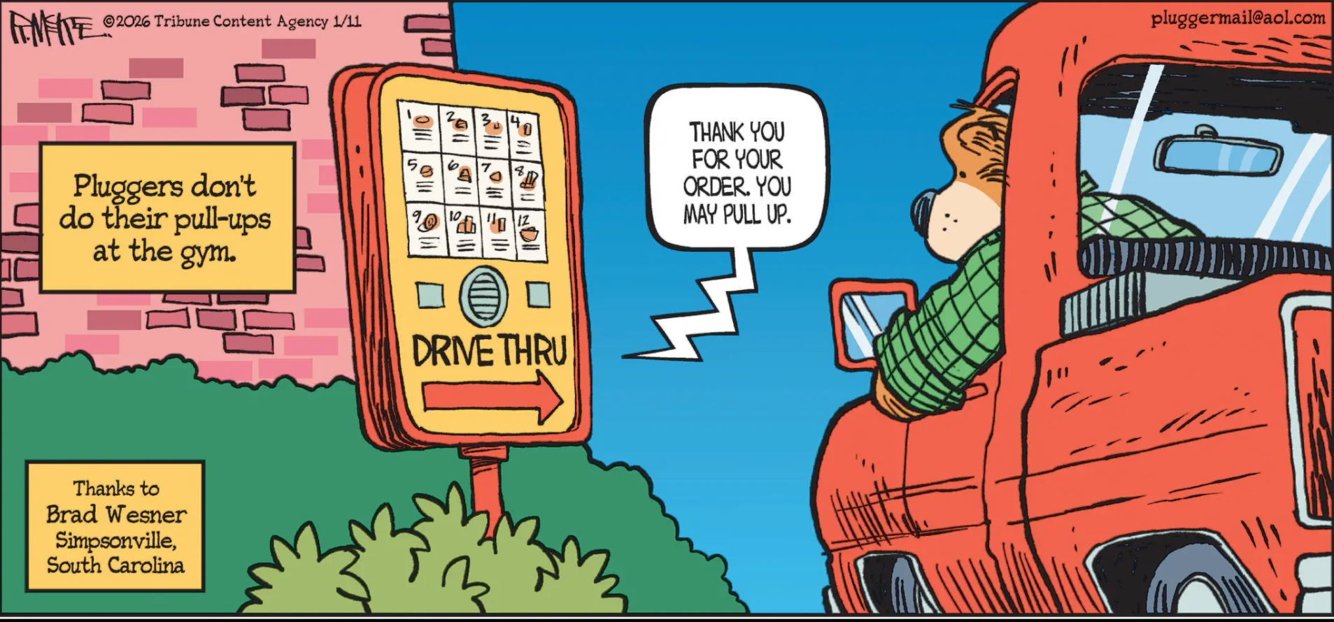 Look, man, people often yell at me for being a coastal elitist because I make fun of the pluggers in Pluggers, but today’s strip is about how pluggers would rather eat fast food than exercise and they won’t even get out of their car to do it, and I didn’t write this joke. A faithful reader of the strip did, and he sent it into the syndicate, and then they drew it and put it in the newspaper! I’m not the mean one here!