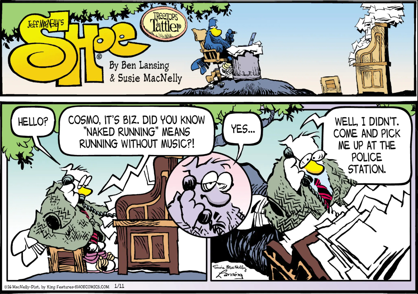 Did, uh, did you know that “naked running” means running without music? I myself did not, and I can’t find much evidence that this is a phrase particularly widely known by others; it’s the name of a company that makes belts for running, and sometimes it’s used more broadly to mean running without any kind of gadgets. But a little poking around to research this turned up this post in a UK running group on Facebook, and, uh, do you think the syndicated newspaper comic strip Shoe stole a joke from a UK running group on Facebook? Who’s to say. We should mostly focus our energy on praying that the brain trust over there never gets wind of “rawdogging.”