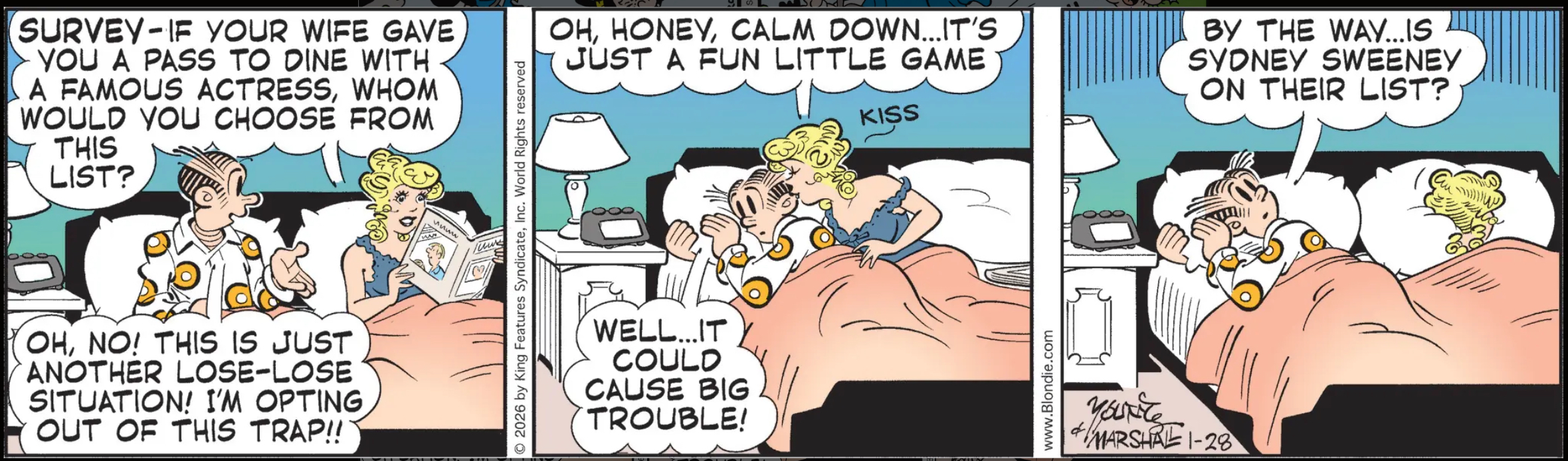 Oh, man, I was all ready to go on a riff about how this is clearly a joke about the idea of a celebrity “hall pass,” e.g., the idea that a monogamous couple would give permission to each other to sleep with specific celebrity crushes, safe in the knowledge that it’s never going to actually happen, but then got sanitized down to the idea of “dining” with a celebrity, even though “dining” is transparently not what this is about, but then I got to the last panel and discovered that the Blondie brain trust is aware of the existence of Sydney Sweeney, and I’m sorry, that’s way too contemporary a reference. Nobody in Blondie should know about anything that’s happened after, oh, let’s say, 2013. “Is Emily Ratajkowski on their list?” is a punchline I’ll allow for this one. Anyone newer than that? No thanks.