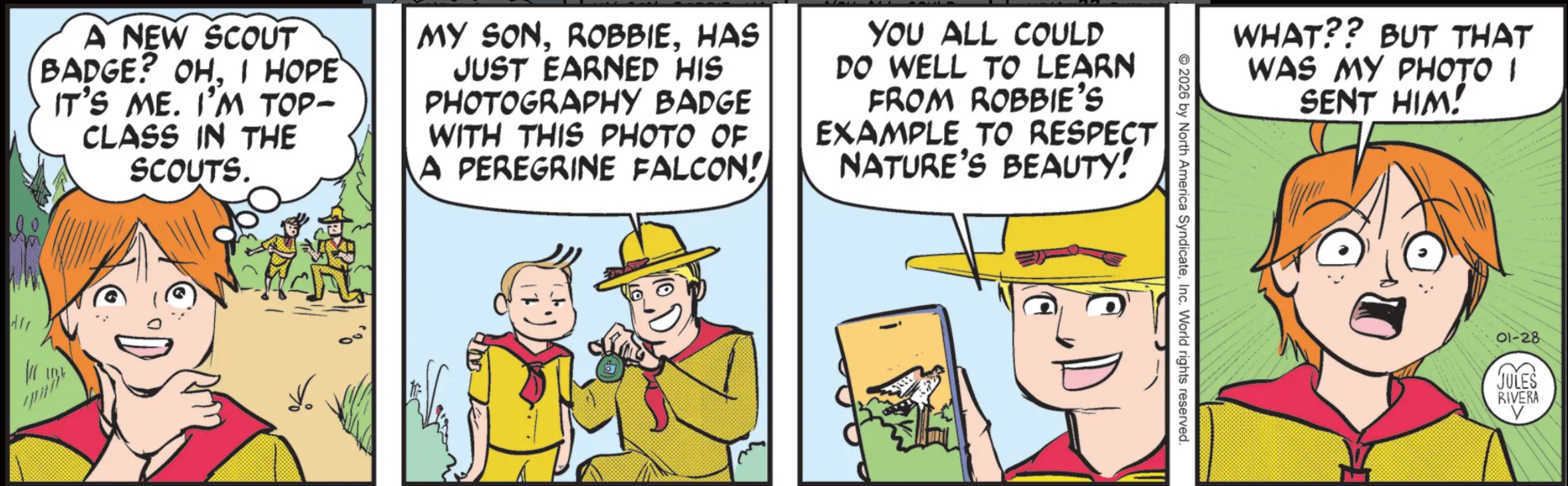 Mark Trail: I was worried when Rivera took over and started writing Rusty as an actual Gen Z kid that he might get too cool and hip, but I’m delighted to announce that “A new Scout badge? Oh, I hope it’s me. I’m top-class in the Scouts.” is a thought bubble so square and perfectly Rusty-esque that even “More information about licorice can be found on the internet“-era Mark would tell him to loosen up a bit.