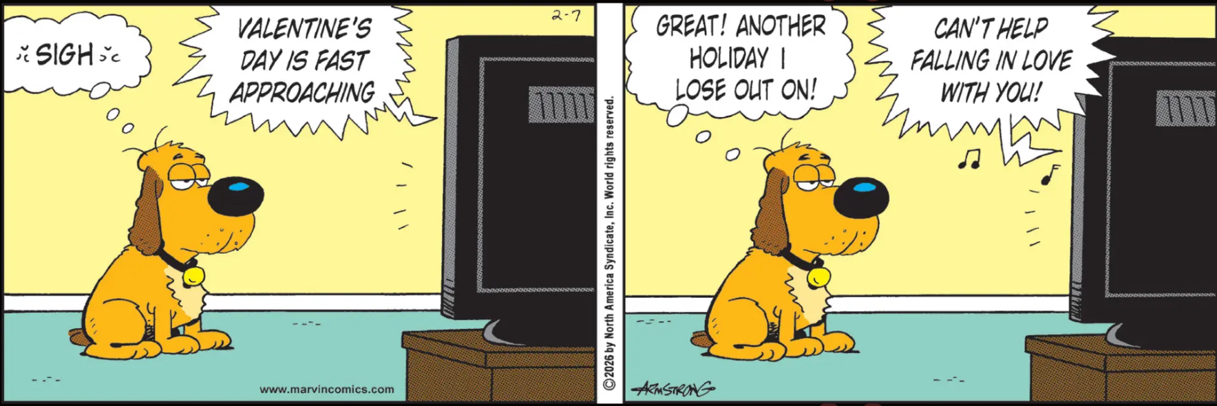 Instead of ending with the “punchline,” Marvin has the television play a song, because it assumes that the average Marvin reader is too stupid or too cut off from fellow humans to know the meaning of Valentine’s Day. Probably wise! Wait I’m reading Marvin.