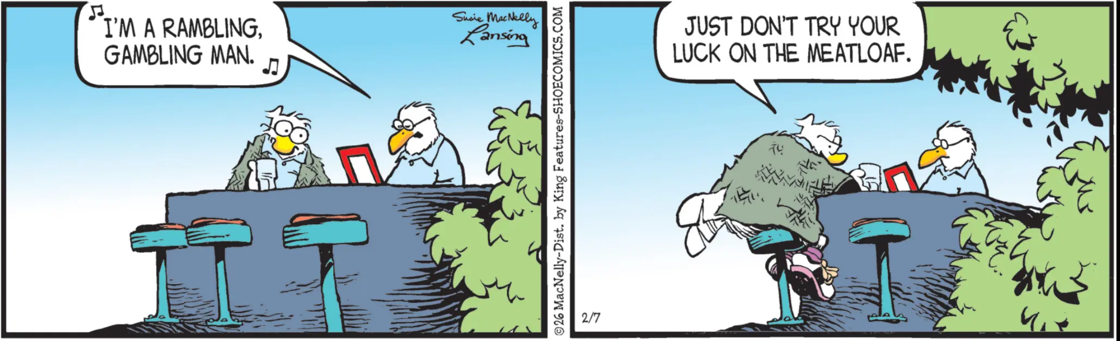 Granted, everyone in Shoe looks extremely depressed, all the time, but that is not someone who is belting out this song in the exuberant manner of the original Bob Seger System recording. That’s a guy who’s basically whispering it to himself, perhaps in a minor key. He doesn’t need the Perfesser cracking wise at him about how bad the food is at this restaurant. He needs some time alone with himself, to ramble and gamble about in his own inner life.