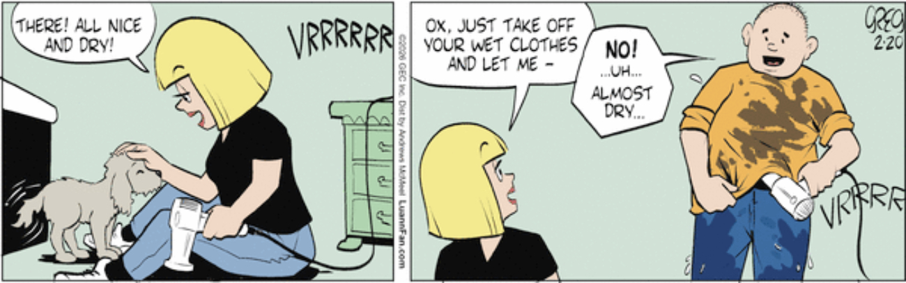 Speaking of sexual bits that newspaper comics have been doing since George W. Bush was president, Luann is doing a tale of ribaldry about Tiffany and Ox (he’s a new-ish character and his thing is he’s a gentle giant, don’t worry about it) washing Ox’s rescue puppy and getting deliciously wet in the process and I can’t believe I just typed that, gross. Anyway, I’m mostly posting this because I think the panel where Ox is sticking the hair dryer up his shirt is pretty funny. It’s just a weird angle! He’s warming his belly button specifically! Is this sexual, for him? Is it even possible to understand what “sexual” means for a guy who is a character in Luann, a realm beyond the sexuality event horizon where horniness is distorted by extreme levels of gravity into formations that scientists can’t even begin to describe?