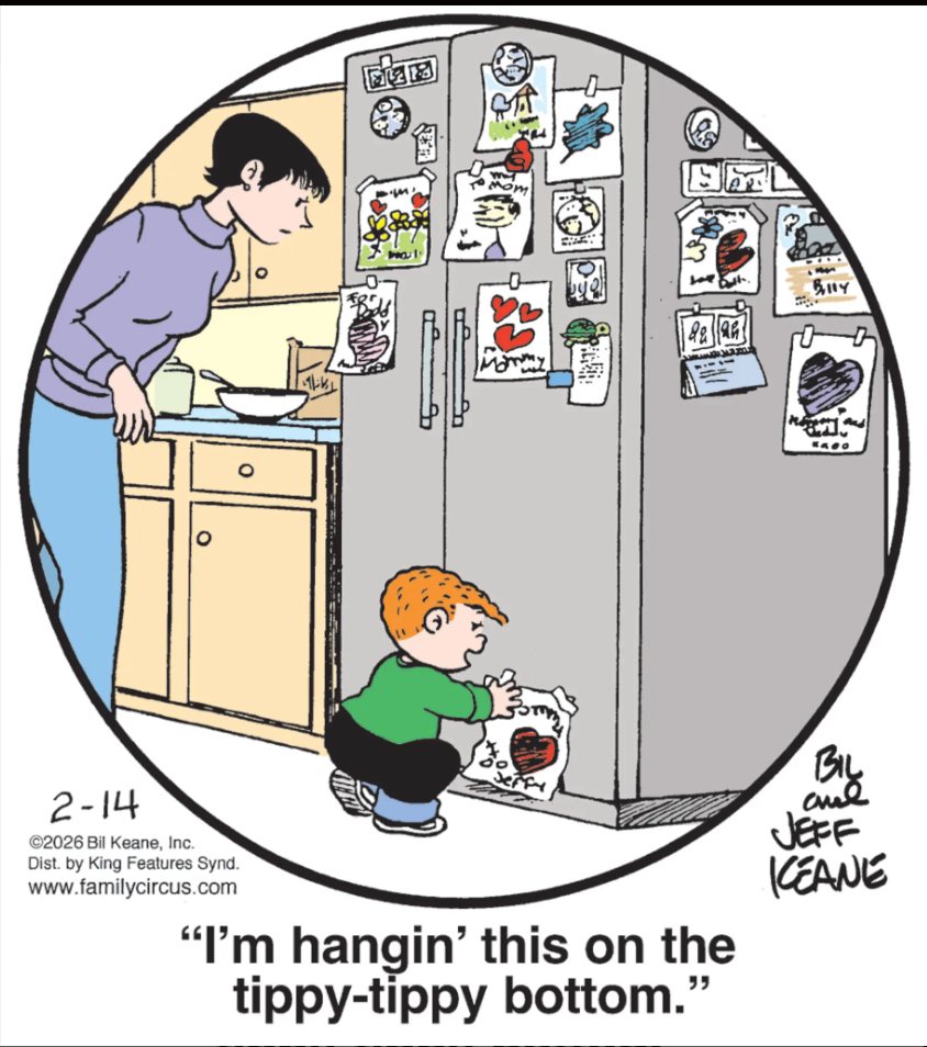 When I was a child, I spoke like a child, I thought like a child, I reasoned like a child, and I found the Family Circus kids annoying. When I became an adult, I put an end to childish ways, and realized that the Family Circus kids are supposed to be annoying and that’s like 90% of the joke of every panel. I really like Ma Keane’s facial expression in this one: “Oh, you’re putting it … uh … there? Where we can all step on it? And you’re definitely going to have a meltdown if I try to move it? Huh. Great. Happy Valentine’s Day to me.”