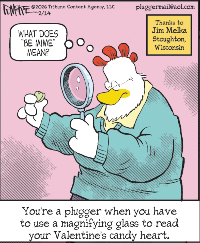 Pluggers: Since chickens can’t chew their food, that candy heart will still say “Be Mime” long after she swallows it whole, until it finally reaches her gizzard and gets ground up into a paste. That’s probably about as romantic as Pluggers will ever get.