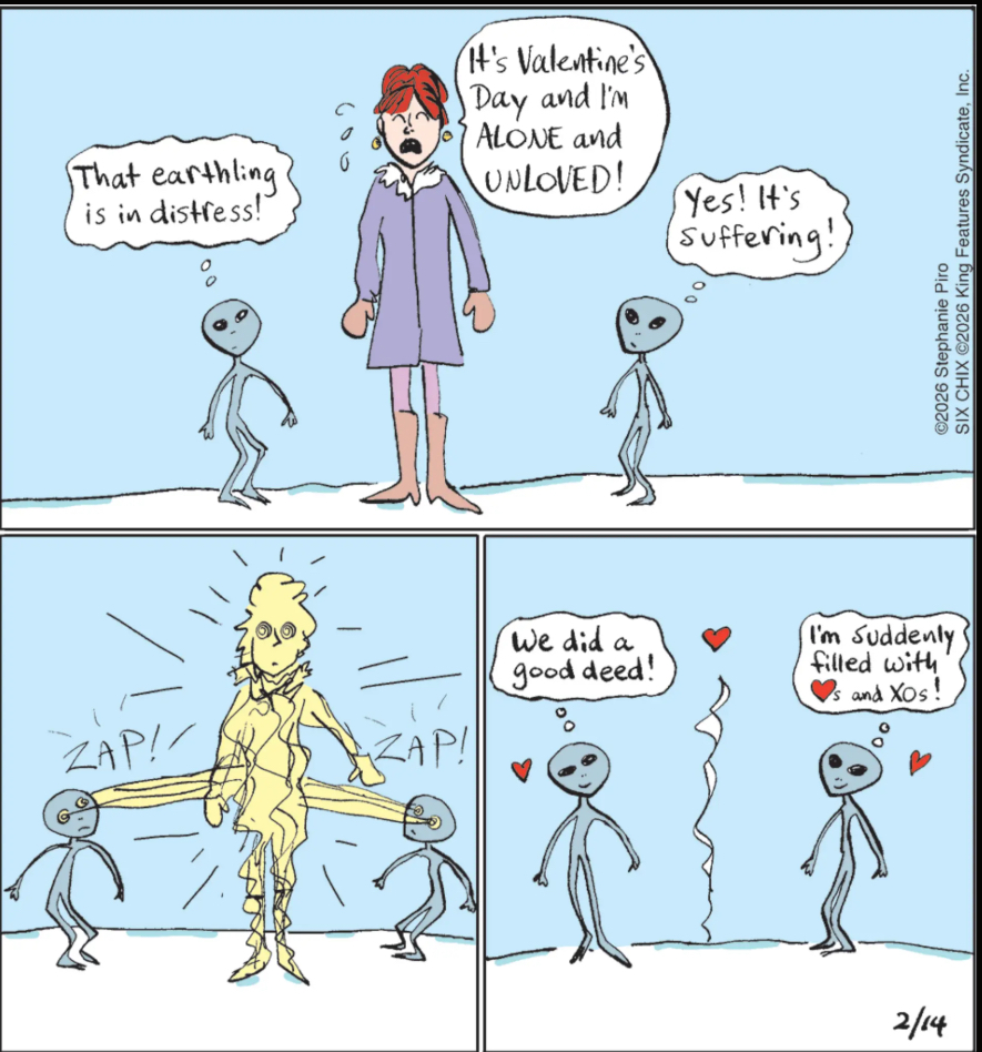 Happy Valentine’s Day, everyone! Are you experiencing romantic love? I hope so, because if you aren’t, aliens are going to vaporize you, just straight-up transform you into a pile of smoldering ash with an energy weapon of unimaginable power.