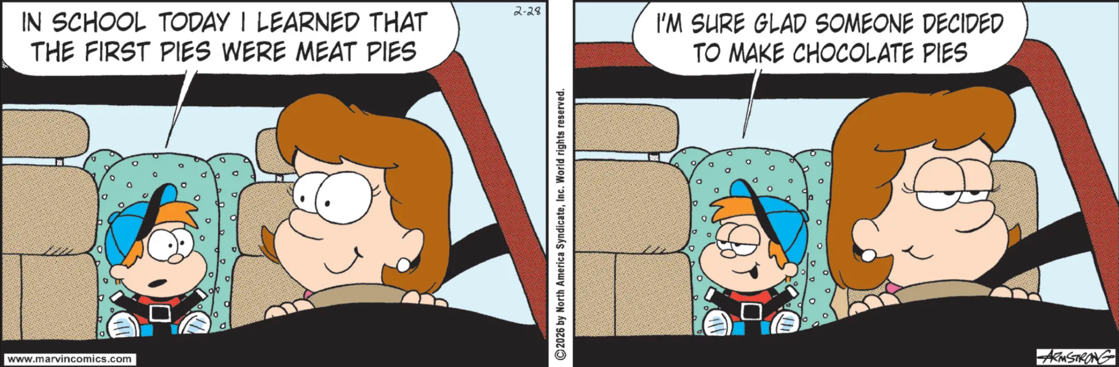 Marvin: The recent-ish development of huge crash-proof toddler car seats becoming mandatory in cars must have been devastating for comics. You can save your old re-runs by sketching in seat belts, but a proper toddler seat means you have to draw a whole new strip. And, well, if these are the best jokes you’ve got…