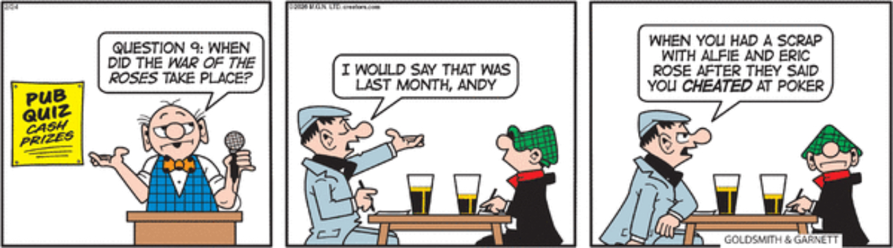 AC: Is Four Roses whiskey sold in England? Because that’s the only War of the Roses I’d expect to be referenced in any pub Andy frequents.