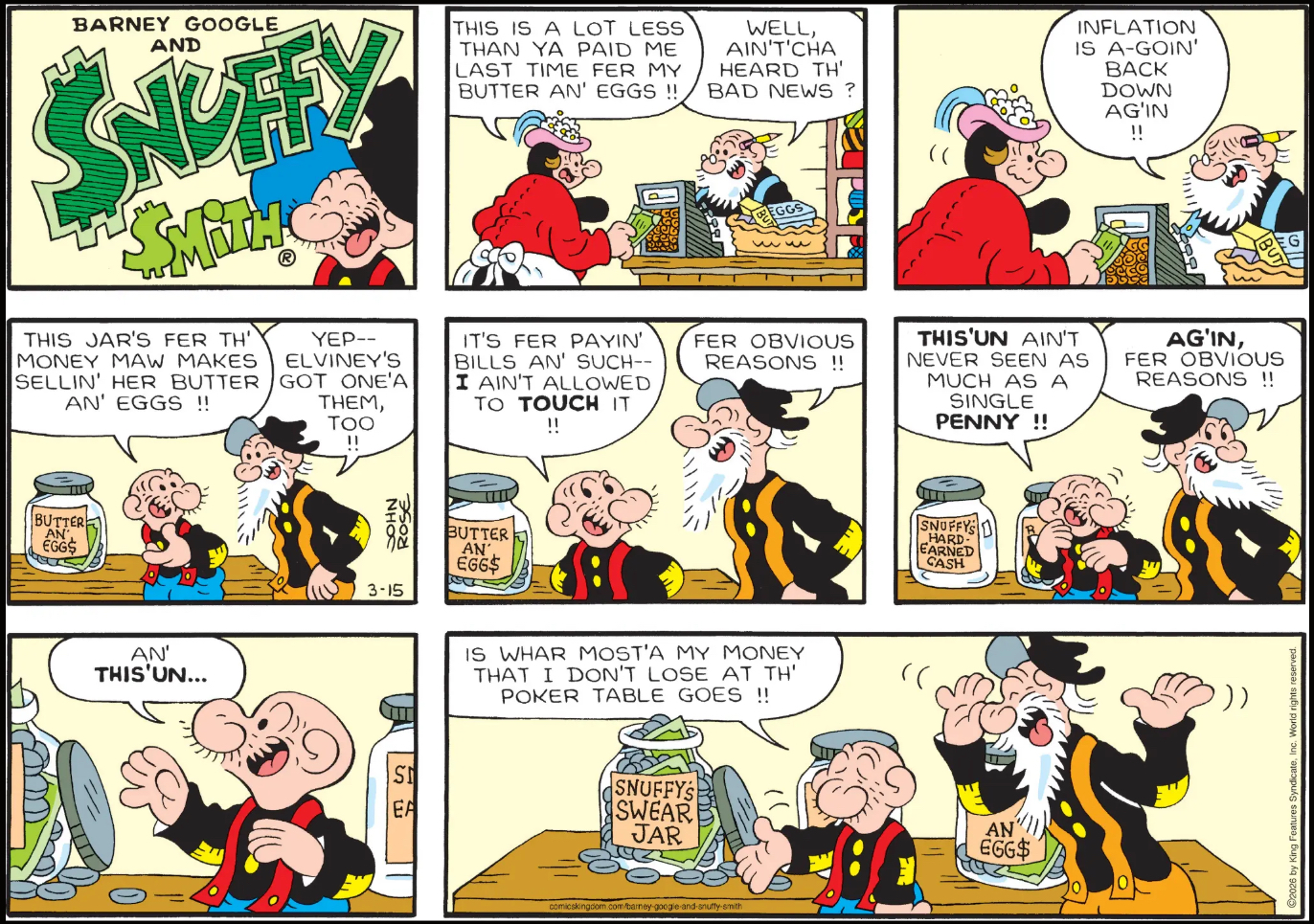 The characters in newspaper comic strips generally keep their vocabulary squeaky clean, and the Hootin’ Holler crew doesn’t even resort to grawlices as far as I can remember. That’s why I’m pretty horrified to learn today that, while we’re not seeing him in action, Snuffy is just letting loose with a nonstop stream of obscenities, blasphemies, and slurs around the house, presumably where Jughaid and li’l Tater can hear. Grim stuff! (It’s less surprising to learn, as we do in the throwaway panels, that even the Holler’s lone semi-legitimate businessman doesn’t know the difference between deflation and disinflation, as flatlanders generally struggle with that as well.)