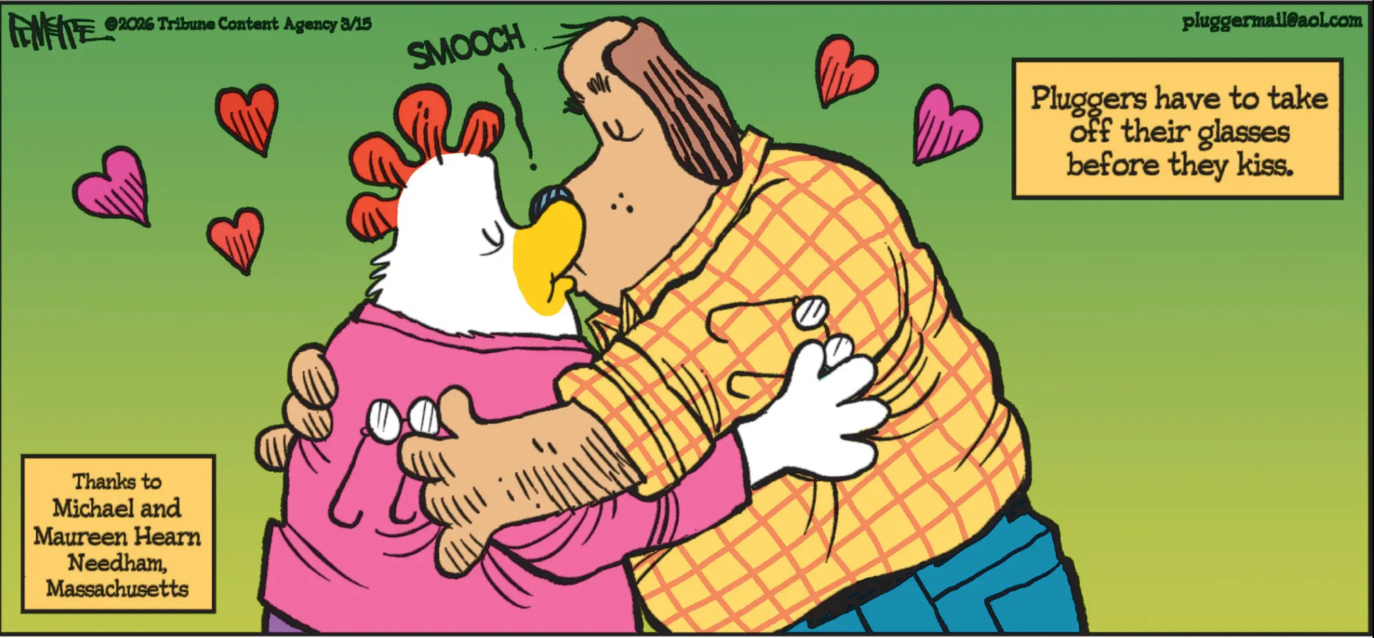 Um, when one Plugger has a beak and the other Plugger has a muzzle, there really isn’t any need to take glasses off to smooch. Trying to think which anthropomorphic Pluggers WOULD need to do so. The cat-man, maybe — he’s got a pretty flat face. But my choices for lady Pluggers are a chicken or a kangaroo, and neither of them is married to, or even dating, the cat. So I mark this gag FAILED!
