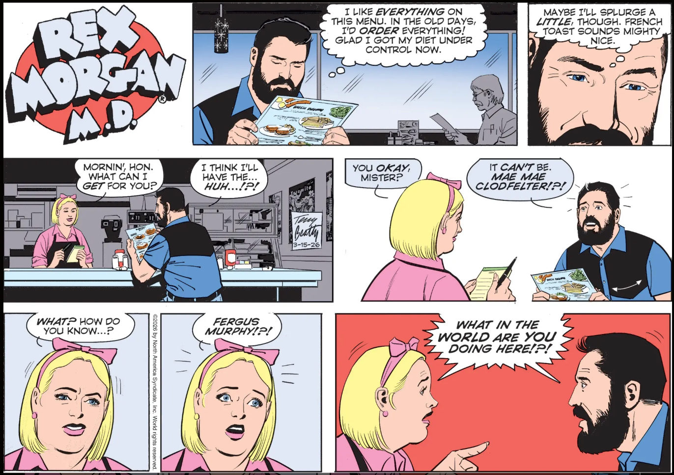 RMMD: In yesterday’s strip, Mae Mae was wearing a name tag. I guess it fell into the stack of pancakes. Also, Mud took a long loving gander at her back porch as he walked into the cafe, but that wasn’t enough to jog his memory.